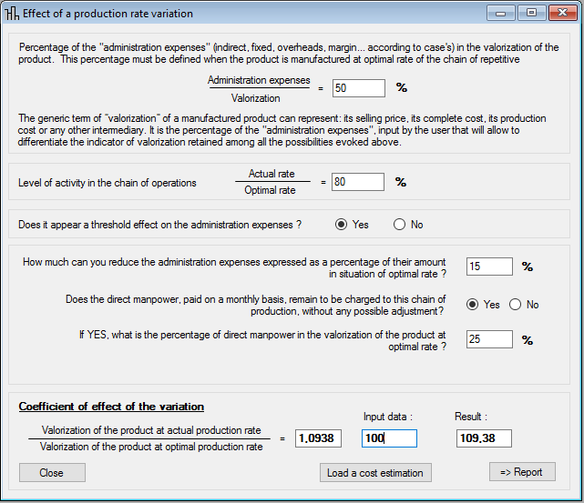 The constant coefficient of learning is that of C(2i) = kg x C(i) where “C” is the cost (or the price) of the manufactured item and “i” its sequence number, that is to say its sequential number of completion from the beginning of the activity. This amounts saying that the production costs are multiplied by kg when the sequence number in the production doubles. A module for calculating the Kg is also available.